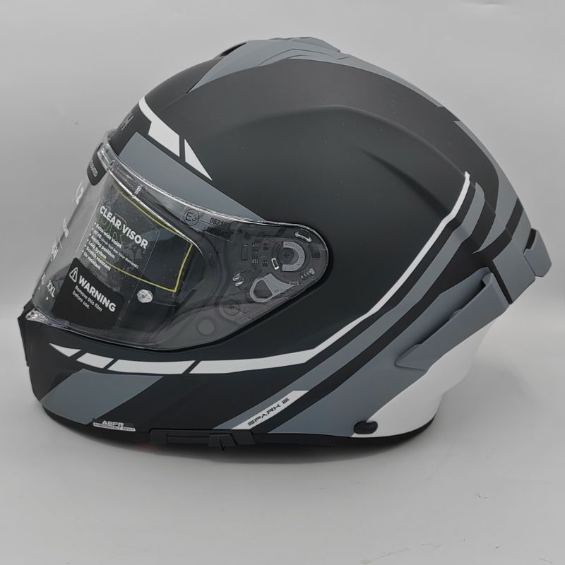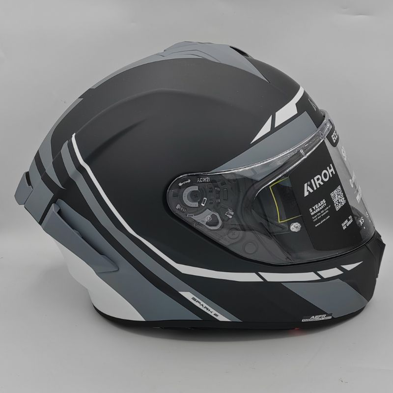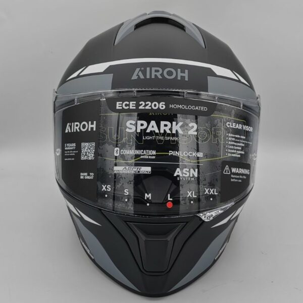 Casco Airoh Spark 2 Spinner grey matt. Casco integrale dall’aspetto sportivo, la sua calotta è realizzata in resina termoplastica HRT (High Resistence Thermoplastic) ad elevata resistenza e leggerezza. Ampio schermo resistente ai graffi e ai raggi UV con predisposizione Pinlock®. Incorpora la tecnologia ASN (Airoh Sliding Net) e il sistema ATVR (Airoh Tool-less Visor Removal) per un facile smontaggio. Il sistema di ventilazione è composto da prese d’aria nella zona superiore e uscite nella parte posteriore. Chiusura micrometrica.