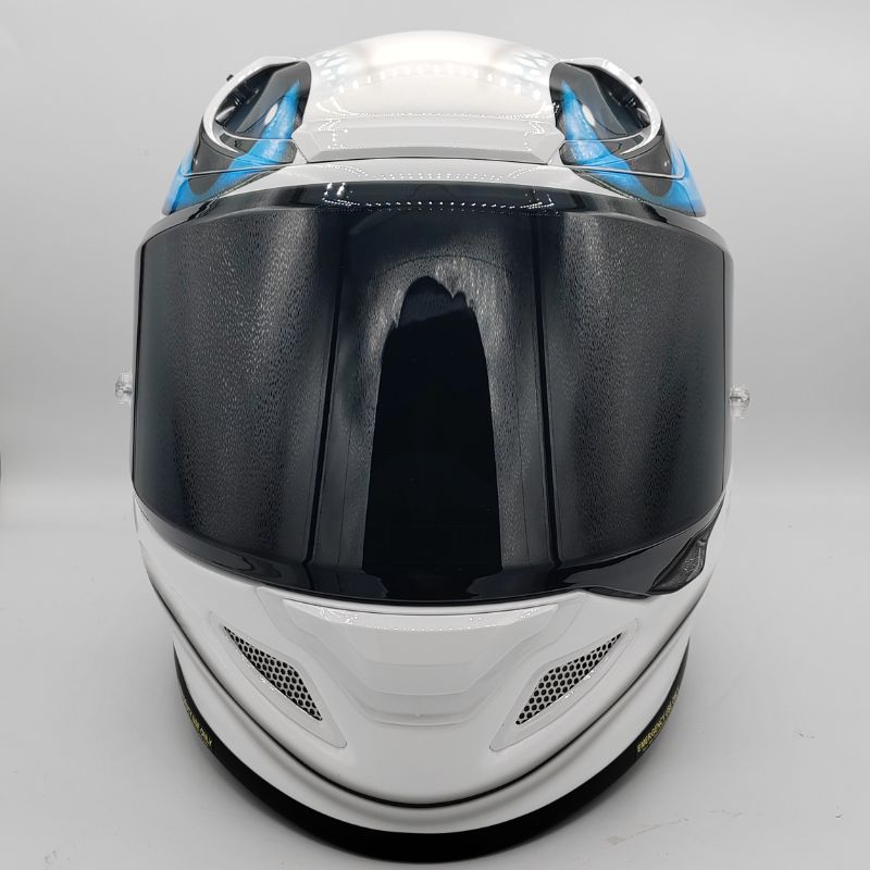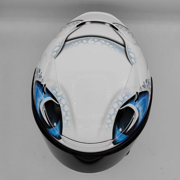 L’estetica del casco HJC RPHA12 Universal Light Fury è davvero unica: con una base di colore bianco lucido, il design mette in risalto gli occhi azzurri brillanti e le scaglie bianche perlescenti di Light Fury. La presenza di un sorriso elegante, delineato da un vivace celeste lucido, rende omaggio al fascino del personaggio. Il marchio di autenticità posto sul retro conferisce un ulteriore tocco distintivo a questa grafica straordinaria.
